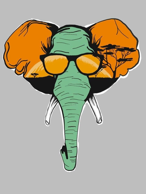 Embrace the spirit of the wild with a modern twist. This artistic piece blends the majestic silhouette of an African elephant with a vibrant sunset landscape. Featuring a unique teal and orange color palette and a "cool" persona with retro shades, this design is perfect for those who love contemporary wildlife art and safari vibes.